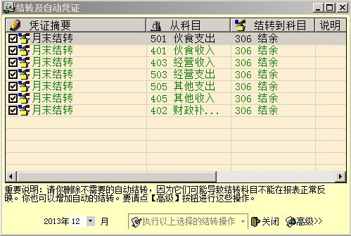 点击执行操作按钮旁边的小三角形,在选择打开的下拉选项中“结转本月期末数”项。年底结转时,选择12月份,即可结转全年的数据了。12月的期末数就是1-12月的累计发生数了。
