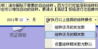 如果是按年的,就不需要每月去做结转,只需要在年终 点击”月末结转“旁边的小三角形,选择12月结转期末数即可。